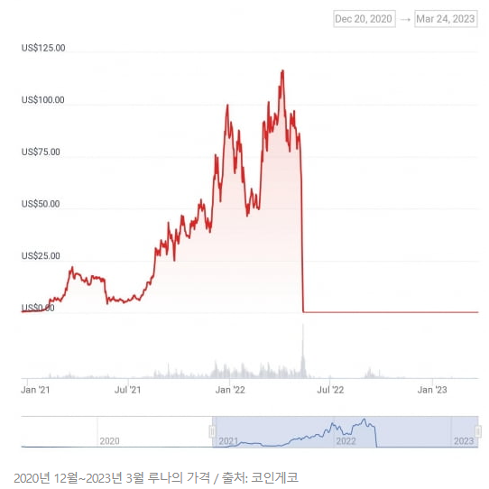 테라폼랩스에서 발행한 코인인 루나는 2022년초까지 1.28달러에서 119달러로 거의 100배에 달하는 상승을 이루어냈습니다. 이 과정에서 많은 경제학자들이 사기라고 비판했으며 비탈릭 부테린 이더리움 창시자의 경고에도 권도형은 무시라는 일관된 자세를 유지하며 '루나는 오르기만 할 것'이라고 주장했습니다.