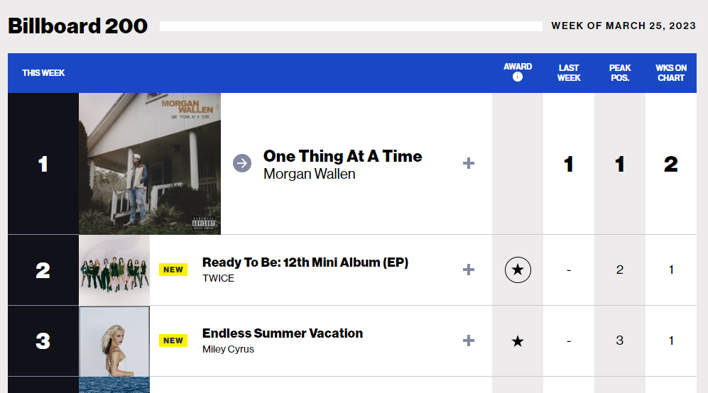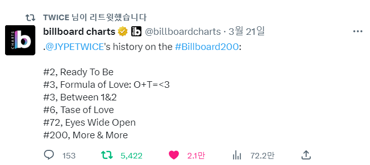 트와이스가 3월 10일에 발표한 미니 12집 'READY TO BE' 앨범으로 '빌보드 200'에서 당당히 2위를 차지했습니다.