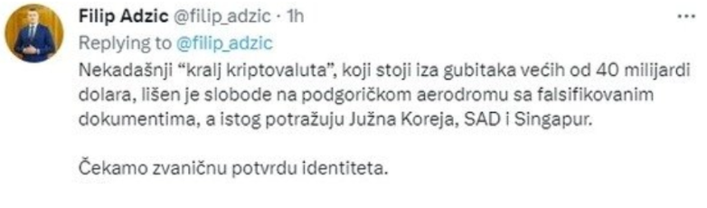 몬테네그로의 내무부장관인 필립 아지치가 23일 트위터에 "세계적인 지명 수배자인 한국의 권도형으로 추정되는 인물을 몬테네그로 수도인 포드고리차에서 검거했으며 현재 신원확인 절차 중에 있다"고 밝혔습니다.